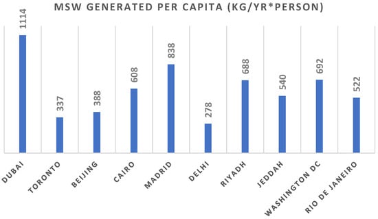 Waste generation per capita refers to the amount of waste generated by each person in a population. The main factor affecting waste generation per capita is the income level of the population, defined by the Gross Domestic Product (GDP) metric. Studies have shown that a higher-income population, on average, generates higher waste per capita compared to a lower-income population [26]. This relationship between GDP and waste generation per capita can be explained by the fact that higher GDP leads to higher consumer activities and business growth [27]. Other factors affecting MSW generation per capita are urbanization, literacy, level of public awareness, and availability of sanitary services [28]. Data for waste generation per capita were reported by the World Bank global data set. Figure 6 shows the MSW generated per capita of ten cities globally, including Riyadh and Jeddah [22].