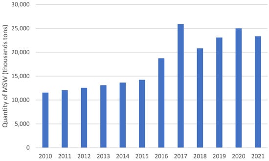 The quantity of MSW generated in Saudi Arabia is shown in Figure 7. The general trend is that MSW generation is increasing every year [29].