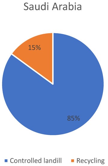 Data for waste management techniques was reported by the World Bank global data set. As can be seen in Figure 9, disposal in controlled landfills is considered the primary waste management technique in Saudi Arabia, accounting for 85% of the total waste. Recycling accounts for the remaining amount, which is 15%. The majority of waste collection for recycling in Saudi Arabia is conducted by an informal sector which gathers and separates paper, plastic, and metallic material waste from MSW [31]. The new strategy in Saudi Arabia will significantly advance achieving the kingdom’s priority of a cutting-edge, low-carbon, and energy-efficient economy. This will significantly advance achieving the sustainable development objectives.