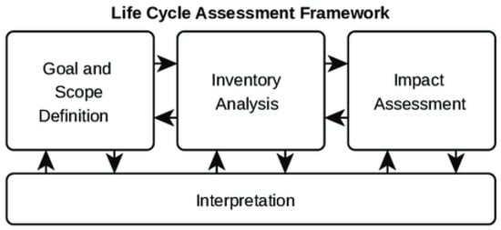 The most recent ISO 14040 standards outline and regulate the procedures for conducting a proper LCA [48]. LCA can be used to compare several options and be integrated into a general decision-making process that considers how a choice will affect the environment. It is frequently used to estimate how alternative waste management strategies would affect the environment. According to ISO14040, conducting LCA is composed of four stages: goal and scope definition, inventory analysis, impact assessment, and interpretation of findings, as shown in Figure 11.