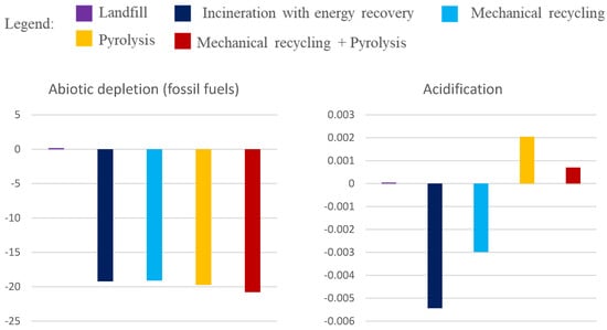 Pyrolysis was shown to have low environmental impacts compared to other scenarios in terms of abiotic depletion of fossil fuels, freshwater aquatic ecotoxicity, human toxicity, and marine aquatic ecotoxicity. However, it has a high environmental impact on acidification and eutrophication, which is driven by using urea as an additive. It might be worthwhile for future studies to consider alternative additives for pyrolysis and assess their environmental impacts using LCA. Pyrolysis has several advantages: first, upcycling waste plastic into useful value-added products, promoting a circular economy. Products can be used in applications equivalent to ones produced from virgin polymers, such as food contact applications [64]. Secondly, it provides an alternative source of energy, since the process of pyrolysis provides fuels as by-products, which will reduce the dependency on fossil fuel term [65]. Thirdly, it eliminates the material degradation that occurs during mechanical recycling, guaranteeing that material value is kept within the plastic economy for the long term [66]. Finally, pyrosis process is less sensitive to dirty waste streams and the presence of composite materials compared to mechanical recycling [66]. The drawbacks of pyrolysis are that it is energy-intensive and requires additional processing steps after plastic molecules are broken down, causing the process to be costly and impacting its economic feasibility [67]. In addition, pyrolysis is sensitive to some types of polymers, such as polyethylene terephthalate, which contain oxygen in the polymer backbone. Release of the oxygen molecules from polymers in the process can affect the process’ efficiency [64].