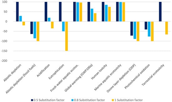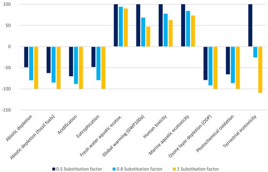 This term is used to describe how much virgin product can be replaced by recycled material. In the base case, the substitution factor was assumed to be 0.5. Higher substitution factors mean more virgin material is displaced by recycled material, which in turn can reduce environmental impacts of the system [56].