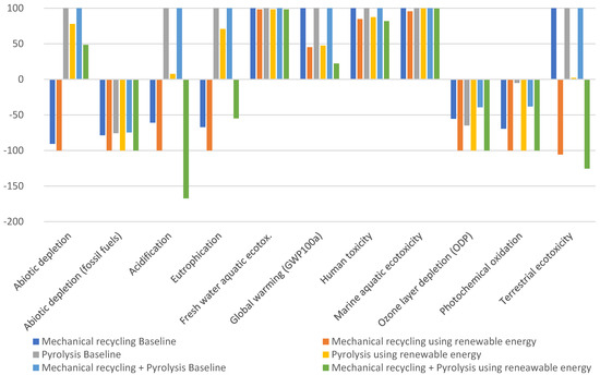 Combining mechanical recycling with pyrolysis seems to leverage the strengths for each method. As discussed earlier, mechanical recycling has better performance in acidification, eutrophication, and global warming. On the other hand, pyrolysis performs well in the abiotic depletion of fossil fuels, freshwater aquatic ecotoxicity, human toxicity, and marine aquatic ecotoxicity. Therefore, the combined scenario improves the environmental impacts across multiple impact categories. In the combined scenario, mono-polyolefin streams are sent to mechanical recycling while mixed plastic waste is sent to pyrolysis. This is the best option, since mechanical recycling is more sensitive to blends and requires robust separation to increase the final product quality. Therefore, the combined scenario can accept a broader range of plastic waste, which improves the overall waste management system towards shifting to a circular economy. In addition, the combined scenario means that more plastic waste can be managed, which reduces the dependency on landfill and incineration. It is also recommended to utilize renewable energy for electricity generation. As can be seen in Figure 20, it has a significant impact across all impact categories. For the combined scenario, abiotic depletion is reduced by more than 50%. Acidification, eutrophication, and terrestrial ecotoxicity have become overall environmental benefits while the baseline is an environmental burden. Finally, global warming potential is reduced by 80% compared to baseline.