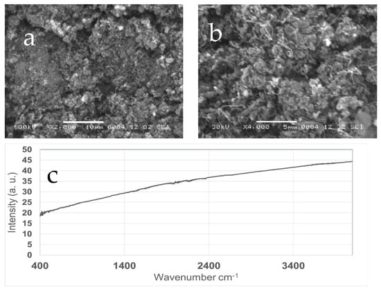 The SEM images of CNFs are shown in Figure 1a,b, respectively. The SEM micrographs were obtained using a JEOL JSM-5400 LV SEM (JEOL Ltd., Akishima, Japan). An acceleration voltage of 5 kV was conducted for the measurements. The magnifications ranged from 100 to 2000×. Images depict a thick proliferation of homogeneous cylinders CNFs of various sizes. These data demonstrate that the inner surface of a commercial stainless-steel tube may facilitate the formation of CNFs at a temperature of 680 °C without the need for additional catalysis. As moderate oxidation settings were maintained to prevent damage to the CNFs, amorphous carbon residues resistant to oxidation remained attached to the CNFs’ surfaces. Moreover, FTIR analysis was carried out for the synthesized CNFs, as shown in Figure 1b.