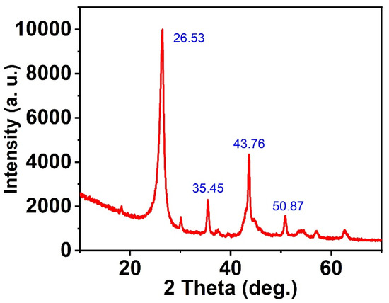 In addition, CNFs were characterized through XRD (Figure 2). The patterns show a distinct, sharp, and high-intensity peak around 2-theta 26.53, 35.45, 43.76, and 50.87, thereby confirming the presence of highly crystalline graphitic CNFs. These results agree with the recent works [66,67]. Further, the BET value was measured for CNFs and found to be 335 m2/g. This indicates the extreme surface area of the synthesized CNFs.