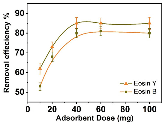 The influence of the adsorbent dosage, which establishes the adsorbent’s capability for a specific ES-Y and ES-B concentration, is one of the critical parameters in ES-Y and ES-B removal investigations. Figure 3 illustrates how such an adsorbent dosage affects how effectively ES-Y and ES-B are removed through an aqueous medium. Different adsorbent concentrations of the CNFs dose ranged from 10 to 100 mg for the 50 mL, 50 ppm ES-Y and ES-B solutions. In the initial phases, the data demonstrate that the percent of ES-Y and ES-B clearance increases with the increase in adsorbent dosage; however, no substantial improvement was seen afterward. The removal efficiency, which seems dependent on CNFs, is 62.0% to 86.0% for ES-Y and 53.5% to 83.0% for ES-B, correspondingly. This means that there is 40 mg of CNFs uptake 43.0 ppm for ES-Y and 41.5 ppm for ES-B from an aqueous solution containing 50 ppm of phenol concentration. The adsorption efficiency of ES-Y and ES-B ions is enhanced based on the adsorbent dosage of 0.040 g. After this dose, the adsorption is peripheral and steady [68,69]. Therefore, it is concluded that 0.8 g/L of CNFs is the ideal concentration for this experiment. Our findings concur with those findings [70].