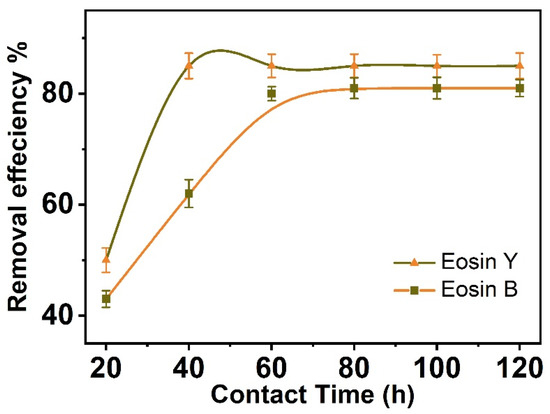 After the adsorbent dose, the influence of shaking duration is the second-most-critical factor in determining the biosorption equilibrium time in batch biosorption studies [71]. The shaking time required to establish an optimum outcome was influenced by the surface properties of CNFs and their accessible adsorption sites. Figure 4 depicts the influence of contact time on the removal efficiency of ES-Y and ES-B from aqueous solutions. The effect of shaking time on the biosorption of ES-Y and ES-B onto CNFs was investigated as a function of contact time ranging from 20 to 120 h at neutral medium, 278 ± 1 °K, and 150.0 round per minute. The graph displays ES-Y and ES-B removal efficiencies for CNFs varying from 50% to 84.0 for ES-Y and 43% to 80% for ES-B, respectively. During the earliest phases, the adsorption effectiveness of ES-Y and ES-B on CNFs increases dramatically, suggesting an abundance of active binding sites that are easily accessible. The curve eventually reaches a plateau, indicating that the absorbent is saturated at this level. According to the graph, the ES-Y and ES-B removal efficiencies for both CNFs achieve equilibrium after 60 h. With the steady occupation of active binding sites, a prolonged interaction period does not significantly improve. After equilibrium, ES-Y and ES-B adsorption uptake does not vary substantially with time [72]. This demonstrates that the optimal shaking duration is 60 h, which is adequate to achieve equilibrium for the most significant removal efficiency of ES-Y and ES-B ions from aqueous solutions by CNFs.