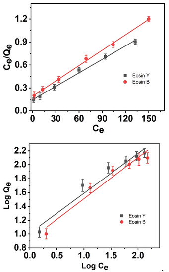 where Qe is the equilibrium adsorption mass of ES-Y and ES-B per unit mass of adsorbent (mg/g) and the concentration of ES-Y and ES-B at equilibration is denoted by Ce (mg/L). Qmax is the maximum absorption specificity at saturation of the monolayer (mg/g). KL is the Langmuir constant, while Kf is the Freundlich constant. n is an empirical variable that varies based on the heterogeneity of the adsorbent’s surface.