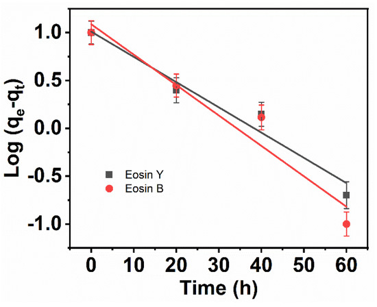 The rate constant of the pseudo-first-order was introduced as k1 (min−1). Figure 9 shows the linear plots of log (qe − qt) versus the time of the adsorption process (t).