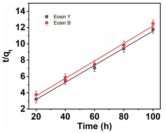 The pseudo-second-order kinetic model was used for the adsorption process of ES-Y and ES-B molecules on the surface of CNFs at a time (T).