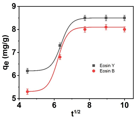 qe is the adsorption capacity (mg g−1), t is the time (min) of the adsorption process, kid (mg g−1 min−1/2) is the rate constant of the intra-particle diffusion (slope), and C is the thickness of the surface (intercept) respectively. As illustrated in Figure 11, the nonlinear plots of qe versus t1/2 are comprised of two stages. Firstly, the ES-Y and ES-B molecules take part in the adsorption process on the surface of the adsorbent molecules. The next stage involves diffusion within the pore of adsorbent molecules. The plots show that the intra-particle distribution is not the principal rate-controlling step, and the adsorption of ES-Y and ES-B onto CNFs is not easy to express using available isotherm models.