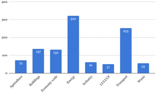 Number of climate change mitigation policies in the EU for selected sectors. Data retrieved from the ‘Climate Change Laws of the World database’ by Grantham Research Institute on Climate Change and the Environment & Sabin Center for Climate Change Law (https://climate-laws.org, accessed on 20 June 2022).