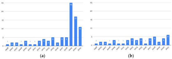 Number of carbon farming policies per year of adoption: (a) full dataset; (b) dataset excluding NECPs and UNFCCC long-term strategies.
