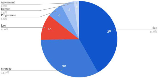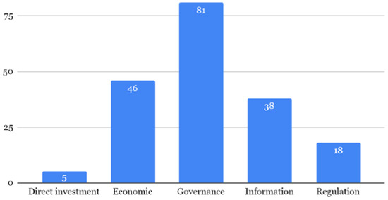 In line with the high number of plans and strategies, Figure 5 shows that the large majority (89%) of policies in the dataset use governance instruments to address carbon farming. Other instruments are used to a lesser extent. In particular, there is a low number of policies using instruments of regulation and direct investment. This supports Verschuuren’s argument that regulatory intervention for agricultural mitigation needs to be stepped up in the EU [19].