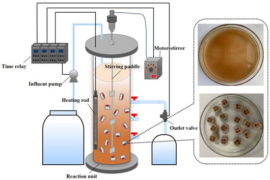A 14.50 L lab-scale SBBR–anammox reactor was used and the stirring device adopted an electric mixer and stirring paddle with a rotation speed of 65 rpm (Figure 1). In the SBBR–anammox system, K1 porous plastic carriers, made of HDPE, were utilized as the type of carriers. The specific surface area of the carriers used in this experiment was 800 m2/m3, with a specific density of 0.95 g/cm3. With the addition of trace elements such as hydrophilic groups, it took only 3–15 days to hang the film. The temperature in the SBBR–anammox system was controlled by heating rods. The dissolved oxygen (DO) concentration and temperature were controlled below 0.05 mg/L and 31.2 ± 0.6 °C, respectively.