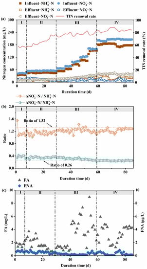 Furthermore, the collection of effluent samples was filtered with a membrane filter (0.45 μm). Total inorganic nitrogen (TIN) was calculated with the sum of NH4+-N, NO2—N, and NO3−-N [33]. Based on the stoichiometric formulas of Vázquez-Padín et al. [34], the TIN removal rate, free ammonia (FA), free nitrite (FNA), nitrogen removal rate (NRR), and nitrogen load rate (NLR) were calculated by relevant methods, shown as follows: