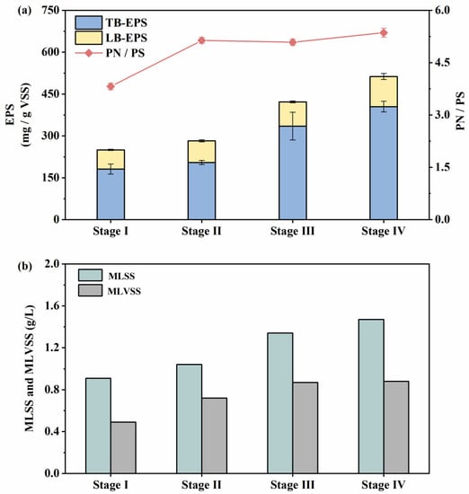 A previous study reported that EPS would affect the physicochemical properties of anammox sludge, such as microbial structure, sedimentation performance, adsorption capacity, etc. [42]. The secretion of endogenous EPS could help anammox bacteria to resist adverse external environments and maintain cell activity [43] and promote cell aggregation to form granular sludge [44,45]. In this study, the concentration of TB-EPS increased from 181.16 during stage I to 404.91 mg/g VSS during stage IⅤ (Figure 3a), with an increase in the NLR. The previous study demonstrated that a high proportion of TB-EPS would improve the structural stability of sludge, which was further conducive to the improvement of nitrogen removal performance [46]. Moreover, EPS has a tendency to mediate the dense formation of anammox biofilms, further promoting the enrichment of anammox bacteria and providing corresponding substances and required enzymes [47,48]. A previous study found that the performance recovery of the anammox system would be further enhanced, which was conducive to the improvement of EPS content with the increase in the NLR [49].