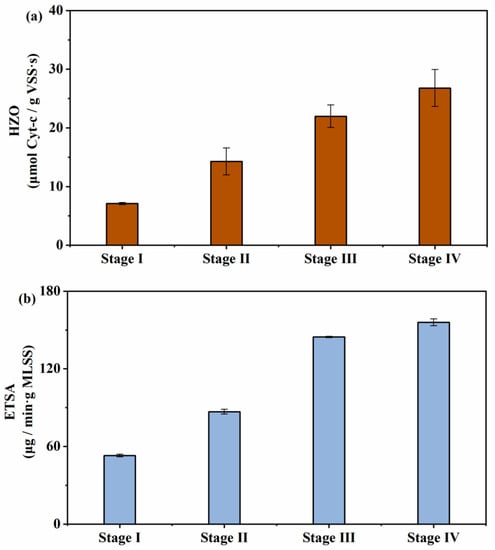 The enzyme activity indicated the working state of the anammox reaction system to some extent. Figure 4 shows the activity of the HZO enzyme and the ETS of the anammox bacteria. Actually, HZO is a crucial enzyme in the conversion of hydrazine to nitrogen during the anammox reaction, which is only found in anammoxosome inside anammox bacteria [52]. The HZO activity of the biofilm increased from 7.11 during stage I of the experiment to 26.78 μmol Cyt-c/(g VSS·s) during stage IV. It could be seen that loading a certain number of microbial carriers in an anammox system could improve the enrichment of microorganisms and also the expression level of nitrogen metabolism, which played a crucial role in the rapid recovery and maintenance of good stability for the entire sludge system.