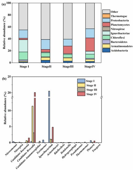 In this study, 16S rRNA gene-targeted amplicon sequencing was used to analyze the succession dynamics of microorganisms at different recovery stages to determine the relationships among key bacterial communities. The main bacteria at the phylum level are Proteobacteria, Planctomycetes, and Chloroflexi (Figure 5a). Anammox bacteria belonged to Planctomycetes and metabolized very slowly, and their relative abundance in the biofilm increased from 4.36% during stage I to 22.25% during stage IV. Planctomycetes is a typical phylum representing anammox microorganisms [54]. It has demonstrated that Planctomycetes could be used for the initial breakdown of various highly complex polysaccharides, thus making them available to other microbiomes and then playing a key role in the biogeochemical transformation of the carbon and nitrogen cycles [55]. The increasing abundance was associated with the improvement performance of nitrogen removal during the recovery stage. A previous study also reported that Planctomycetes possess special characteristics, such as a dynamic intimal system, a peptidoglycan cell wall (Gram-negative), a separator structure, the presence of C1 transferase, ladane lipids, and the ability to oxidize ammonia anaerobically [56]. This indicated that anammox bacteria have diverse and complex sludge characteristics. Moreover, Chen et al. [57] found that Planctomycetes-affiliated differentially expressed proteins showed a wide range of functional potential and activities by using proteomic techniques, especially the presence of a large number of metal ion binding proteins in the Planctomycetes. The existence of metal ion binding proteins might trap metal ions in the anammox system, which could trigger biofilm formation or cell aggregation. This indicated that anammox bacteria harbored strong adhesion and could easily aggregate on the carrier to form biofilm. This laterally confirmed that the increase in the relative abundance of Planctomycetes would enhance the density of anammox biofilm, thus improving the mechanical strength of anammox sludge, which was consistent with the results of this study. In summary, it was the main feature of performance recovery of the anammox system that Planctomycetes at the phylum level gradually became the dominant flora during the recovery stages [58] (Figure 5a). Additionally, Chloroflexi is a generally used metabolite among microorganisms to grow [59,60]. The relative abundance of Chloroflexi in biofilm increased from 6.91% during stage II to 7.04% during stage IV. The results suggested that the metabolic flexibility and adaptability of microorganisms were enhanced, and the substrates provided for Chloroflexi had increased with gradual recovery of the anammox system.