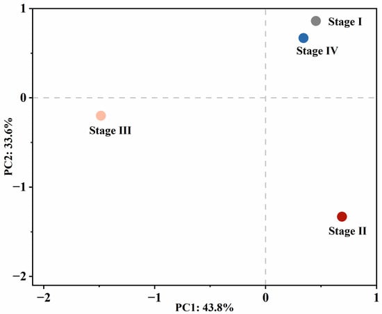 Principal component analysis (PCA) was used for analyzing the similarities in microbial community diversity in four biofilm samples at different recovery stages. Figure 6 shows that the closer the distance between the different stages, the smaller the differences in community composition between the different stages. The results of the PCA showed that the dataset variance was explained by PC1 and PC2. In addition, the contribution rates of PC1 and PC2 were 43.8% and 33.6%, respectively (Figure 6), which showed that the SBBR–anammox system at stage I and stage IV had a similar community composition. In addition, data analysis also played an important role during the recovery stage of the anammox process, and the corresponding mathematical model could be established to continuously optimize the operation parameters of the anammox system. It was found that the corresponding rules among microbial communities could be further explored, which contributed to achieving cost-saving and energy-saving treatment technology in the anammox process.