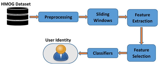 The “Materials and Methods” Section 3 is broken into numerous subsections. The dataset utilized in the study is explained in Section 3.1, including information on the HMOG public dataset. Section 3.2 focuses on the strategies used to preprocess the accelerometer data to ensure their quality and suitability for analysis. In Section 3.3, the feature extraction procedure is described, along with the specific features extracted from the accelerometer signals. The feature-selection strategies used to determine the most-useful features are discussed in Section 3.4. The class imbalance issues are addressed in Section 3.5, along with techniques for dealing with this obstacle. Finally, in Section 3.6, the numerous machine learning classifiers utilized in the study are introduced, with specifics on how they were used in the user identification/authentication process.