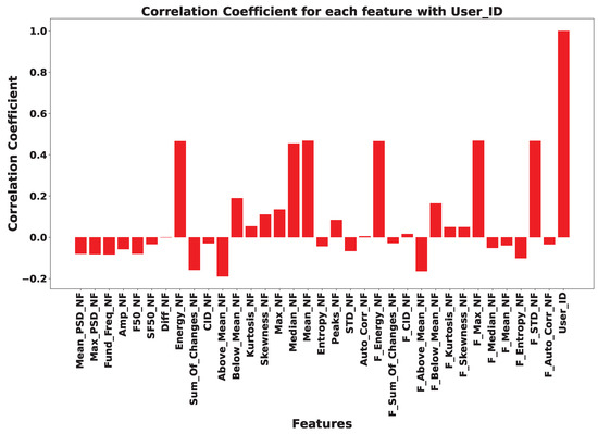 The features that had a Correlation Coefficient greater than 0, as shown in Figure 3, were chosen for testing with various classifiers for identifying users. The outcomes of these tests were then compared to the results obtained from other feature-selection methods and with the results obtained from all features under identical testing and classifier settings.