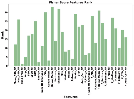 The Fisher Score can also be utilized to determine the importance of features. A different subset of features of top importance (10, 20, and 30 features) was chosen and subjected to the same classifiers for identifying users. The results were compared to those produced by classifiers that utilized all features to determine which approach yielded better results. Figure 4 shows the features with the Fisher Score ranks.