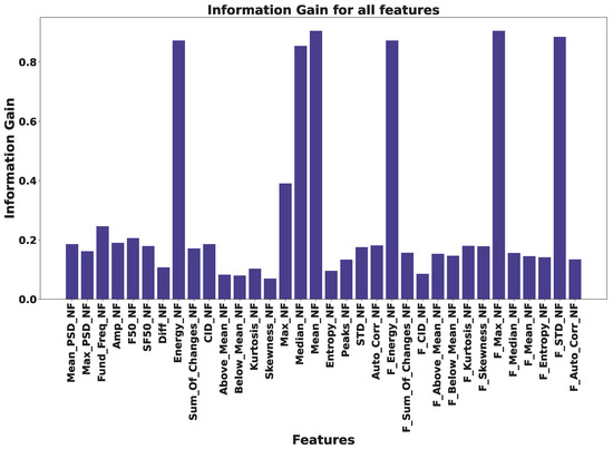 The Information Gain was also investigated as a feature-selection method in this study. Specifically, features with an Information Gain value greater than 0.1 and 0.15 were selected. The Information Gain of each feature is shown in Figure 5.