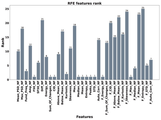 The ranking of features based on their importance is shown in Figure 6, as determined by the RFE, which eliminates the least-important features. Logistic Regression (LR) and Random Forest (RF) were the two models used to determine the importance of the features. The effectiveness of this method was assessed by multiple classifiers, both with 10 and 20 features removed.