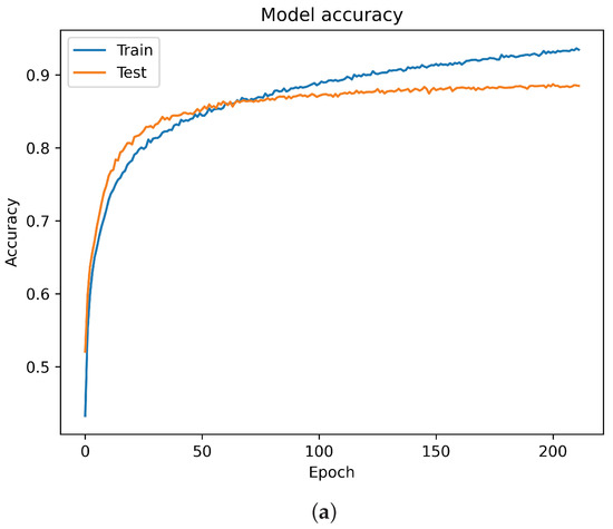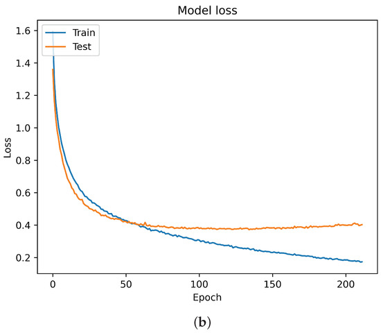 Given that HMOG is a class-imbalanced dataset, XGBoost’s successful performance may be explained by its capacity to modify the training process to place a greater emphasis on the misclassification of the minority class in such datasets [49,56]. Based on the results shown in Table 7, apparently, LSTM was the best choice for the proposed identification system, because it effectively addresses the vanishing gradient and long-term dependency issues and concentrates on the pertinent time series data [64,65]. Figure 9 shows the Accuracy and Loss curves during the training of the LSTM model on 10 users.