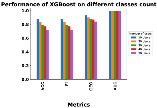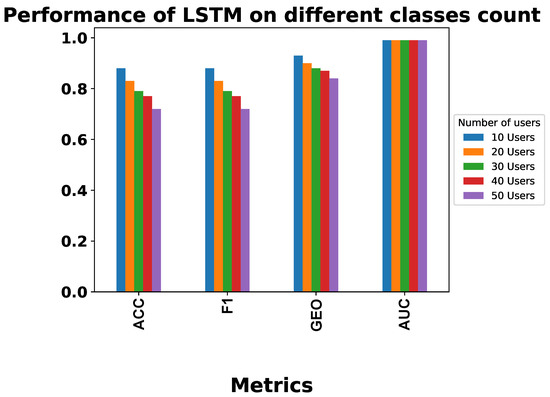 Almost similar results were obtained when increasing the number of users to 20, 30, and 40. Figure 10 shows that the AUC maintained its value despite the increase in class numbers. The F1-Score and GEO were also found to be less affected by the number of classes since they were computed for each class and then averaged over all classes, so they were less influenced by the number of classes than, for example, the Accuracy and other metrics, as shown in Figure 11 and Figure 12, which illustrate the performance of the two top classifiers, XGBoost and LSTM, respectively, using four metrics (Accuracy, F1-Score, GEO, and AUC) for identifying varying numbers of users (10, 20, 30, 40 and 50).