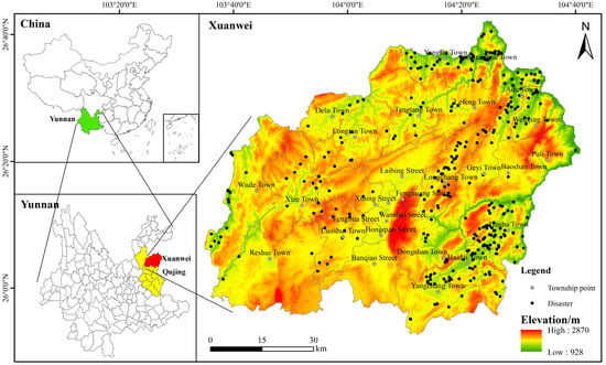 Xuanwei City, situated in Qujing City within Yunnan Province, is located in the northeastern part of Yunnan Province (Figure 1; the grid and vector data of the study area are derived from the geospatial data cloud [https://www.gscloud.cn/ (accessed on 13 April 2023)] and are processed by the ArcGIS platform). Its geographical coordinates range from 103°35′30″ E to 104°40′50″ E longitude and 25°53′30″ N to 26°44′50″ N latitude. Xuanwei City is strategically located at the interprovincial junction of Yunnan and Guizhou, often referred to as the gateway to Yunnan Province. It shares its eastern borders with Panxian and Shuicheng in Guizhou Province, while being separated from Huize County to the west. Xuanwei City shares its southern border with Fuyuan County and Zhanyi County, while its northern boundary is adjacent to Weining in Guizhou Province. The city is situated at a high altitude, characterized by a cool climate, notable diurnal temperature variations, and relatively low rainfall. These environmental conditions make the region suitable for the cultivation of cold-resistant and drought-tolerant crops. Geographically, Xuanwei City is positioned on the outskirts of the Yunnan Plateau, classifying it as a mountainous alpine area. It is a transition slope to the Guizhou Plateau, with the terrain generally higher in the northwest and lower in the southeast. The highest peak in the area is the main peak of East Mountain which has an elevation of 2868 m, and the lowest point is the Lakeng Iron Cable Bridge of the Beipan River, with an elevation of 920 m.