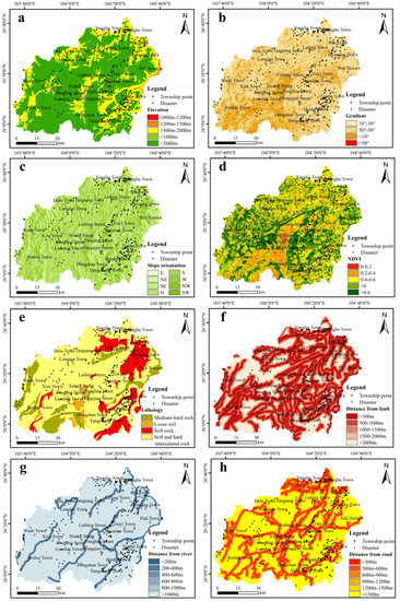 Figure 2. Evaluation factors grading chart. (a) is the grading map of the evaluation factor ‘Elevation’; (b) is the grading map of the evaluation factor ‘Gradient’; (c) is the grading map of the evaluation factor ‘Slope orientation’; (d) is the grading map of the evaluation factor ‘NDVI’; (e) is the grading map of the evaluation factor ‘Lithology’; (f) is the grading map of the evaluation factor ‘The proximity to faults’; (g) is the grading map of the evaluation factor ‘Distance from rivers’; (h) is the grading map of the evaluation factor ‘Distance from roads’.