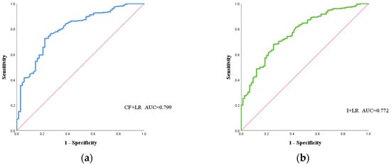 Figure 4. ROC curve of each mode. (a) is the ROC curve of the ‘CF+LR’ model; (b) is the ROC curve of the ‘I+LR’ model. The red line indicates the reference line. The blue line represents the ROC curve of the ‘ CF+LR’ model. The green line represents the ROC curve of the ‘I+LR’ model.