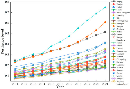 Broken line diagram of regional digital innovation ecosystem resilience level from 2011 to 2021.