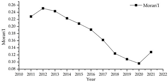 Broken line diagram of global Moran’s I from 2011 to 2021.