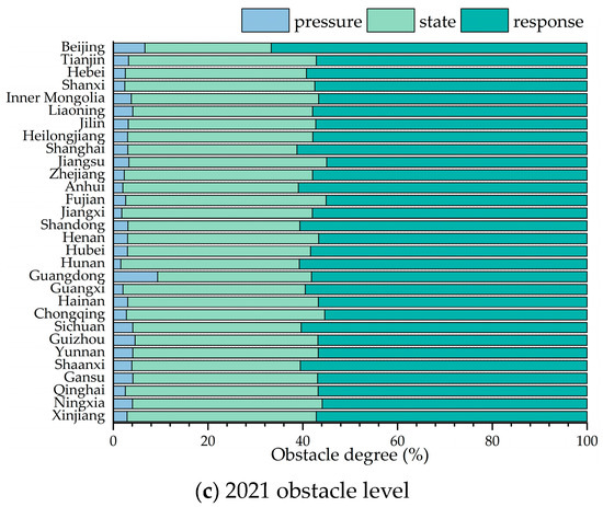 Figure 4 shows the obstacle levels of the indicators for each stage of the digital innovation ecosystem in the 30 regions for 2011, 2016, and 2021. In 2021, the main obstacles to resilience development in the current regional digital innovation ecosystem are the state and response indicators, whereas pressure indicators have a relatively low impact on resilience, accounting for 3.420%, 38.402%, and 58.178% of Stages 1, 2, and 3, respectively. Guangdong had the highest proportion of pressure barriers, which is relatively abnormal, indicating that the digital innovation ecosystem in the region needs to prevent potential risks and ensure that the system operates smoothly. Beijing had a low level of state barriers and the highest proportion of response barriers, indicating that although its system has a large scale and strong stability, its response and recovery capacities to external shocks are insufficient. From the perspective of change, the proportion of pressure disorders increased from 3.180% (2011) to 3.420% (2021) during the survey period, indicating that the instability of the external environment in the past decade hindered improvements in resilience to some extent. The distribution of obstacles in most provinces and cities was relatively stable, and the percentage of obstacles changed slightly at each stage. Guangdong was abnormal: the pressure and state obstacle degrees increased and decreased significantly, respectively; thus, with improvements in the system development level, the risk of external shocks in the region also increased. Accordingly, early warning emergency systems need to be strengthened in the future, along with relevant actions taken in advance, to ensure the stable development of the regional digital innovation ecosystem.