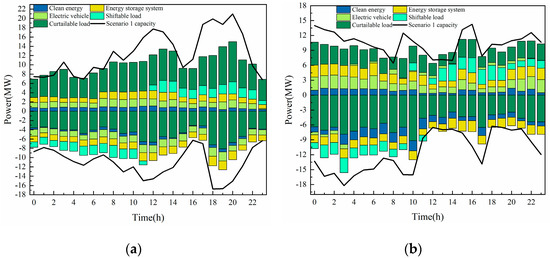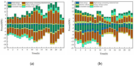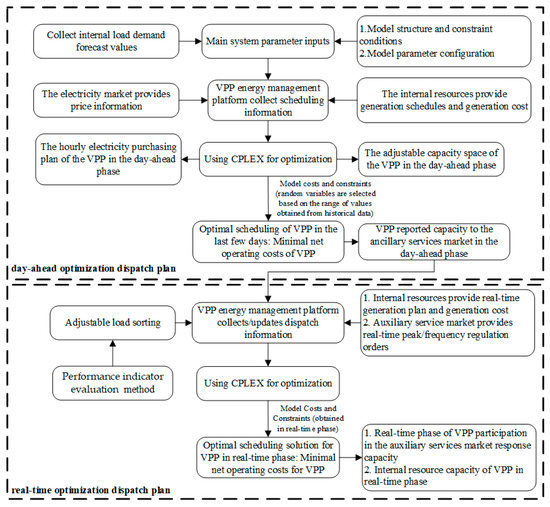 In recent years, VPPs that coordinate and control various types of demand-side flexibility resources have become a hot research topic. They can promote resource cooperation, improve the economy and flexibility of demand-side operation, and enhance the integration of renewable energy sources [5,6]. Several studies have modeled VPPs by aggregating different energy resources and applying optimization methods to schedule their operation. In [7], a multi-objective optimization model for VPP scheduling incorporated wind power, photovoltaic power, electric vehicle fleet, and conventional power plants was developed. In [8], conditional value-at-risk and confidence level theory were introduced to establish a scheduling model that includes wind turbines, photovoltaic generators, conventional gas turbines, energy storage systems, and incentive-based demand response. In [9], a stochastic decision-making model for the coordinated operation of renewable resources and partial virtual power generation was proposed, which incorporates demand response and plug-in electric vehicles to solve the optimal bidding strategy for risk-constrained smart grids. In [10], a coordinated optimization scheduling model for wind and thermal power units was established, considering variable virtual inertia in both day-ahead and real-time operation. In [11], a VPP framework designed explicitly for flexible loads was proposed, aiming to minimize equipment operation costs and optimize grid load fluctuations through a two-level optimization model. The authors of [12] established multi-objective individual and joint scheduling models for a single VPP and multiple VPPs with wind power solar energy storage. The authors of [13] introduced robust optimization theory to construct a VPP stochastic dispatch model that considered uncertainty, price-based demand response, and incentive-based demand response.