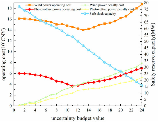 To improve the robustness of the power space of the clean energy generation model, the maximum value and the minimum value of the power generated by clean energy in the dispatch cycle can be obtained by taking the positive and negative fluctuation state variables as , according to the set budget value of dispatch cycle uncertainty: