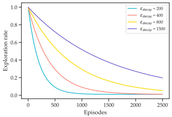 In this algorithm, action is selected through strategy to balance exploration and utilization so that it can generate higher returns. The value of exploration rate ε is attenuated exponentially, and is used to control the attenuation rate, as shown in Equation (13) and Figure 4. A pseudo-code of the Dueling DQN algorithm is shown in Algorithm 1.