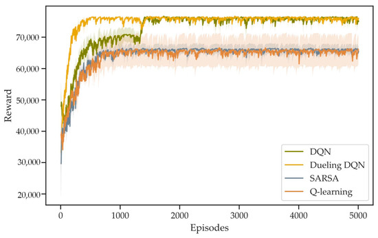 We adopt the same iteration steps and parameters to compare the performance of Dueling DQN, SARSA, Q-learning, and other algorithms. As concluded in Figure 5, compared with SARSA and Q-learning algorithms, Nature DQN and Dueling DQN algorithms improve continuously in continual environmental interaction, thus learning superior pricing strategies. However, the Dueling DQN algorithm converges faster and reaches stable conditions with slight fluctuations after 500 training episodes, while Nature DQN needs 1200 steps. The Dueling DQN algorithm generally learns the state value function with advantage and affects the Q-value of all actions in each update. It is possible to complete more updates in fewer times, leading to a faster convergence rate and more accurate learning than the Nature DQN. Table 6 shows that DRL has better performance and stability and can improve the average rate of return by more than 10% compared with other tabular reinforcement learning algorithms under the same conditions.