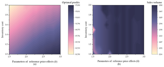 (a) Optimal profits under the influence of different inventory costs and reference prices; (b) sales volume of optimal strategy under the influence of different inventory costs and reference prices.