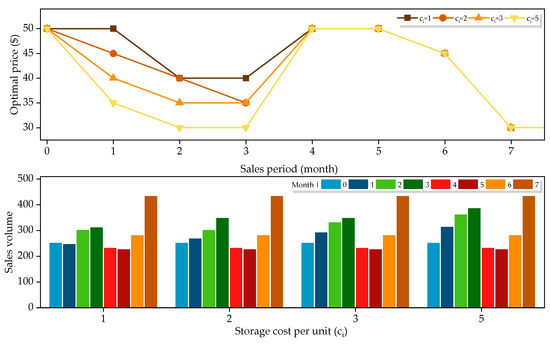 The inventory backlog cost affects retailers’ profit in each period. Figure 7 displays the optimal cumulative profit and sales volume under the joint influence of the inventory backlog cost and the reference price coefficient. It is evident that retailers can sell more commodities and gain higher profits when the reference price has a greater influence on consumers. Therefore, retailers should not overlook the impact of reference prices when making pricing decisions. The findings demonstrate that retailers need to adopt a dynamic pricing strategy to maximize profit under the influence of reference price and reasonably reduce current pricing to increase sales when customers have a better memory of previous prices. Conversely, with the increase in inventory cost, the revenue gained by retailers decreases. The specific pricing and sales are shown in Figure 8. When the cost per unit of inventory rises, retailers sell at a discount in the lead-up to the sale, allowing them to sell more commodities to reduce the backlog of expenses.