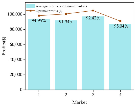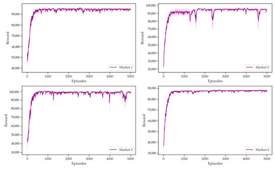 In this experiment, we carried out 5000 iterations for these market environments, and the results are shown in Figure 9. The Dueling DQN algorithm can converge in different environments and obtain better returns. It can be seen in Figure 10 that the average return can reach more than 90% of the optimal strategy, indicating that the method proposed in this paper can be applied to various environments and has universal applicability.