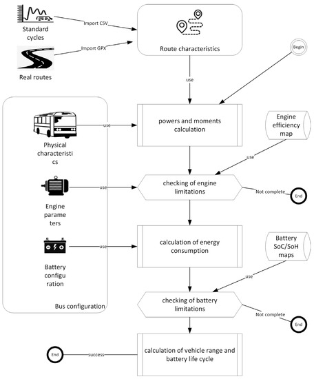 - mathematical models of the bus, the traction system, and the battery allow simulation calculations to be performed to check whether the bus—after modification—will meet the operator’s requirements, what its maximum range will be, and how quickly the battery will age;