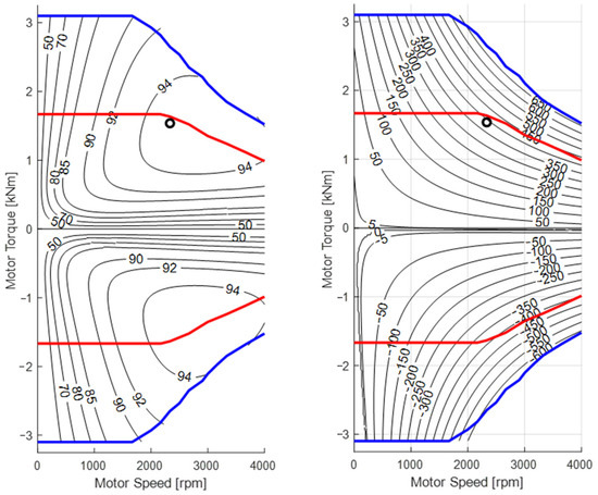 This expression and the dependencies defining the machine’s efficiency for motor- and generator-based operation enable determining loss and efficiency maps within an area limited by a maximum traction specification.