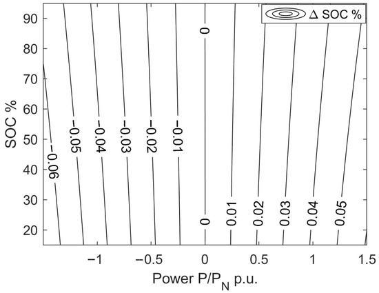 Formula (9) describes an iterative model of the battery operating state for constant ambient temperature and sampling period . The authors assumed the following pack parameters: energy content (battery capacity ), continuous use (charging/discharging , , and maximum performance (CH/DCH , ). The studied model adapted a serial configuration of two packs with two parallel connections.