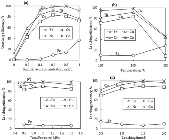 Metals’ dissolution profiles versus (a) H2SO4 concentration at 150 °C, 1 h, and 0.6 MPa; (b) temperature at 0.6 mol/L H2SO4, 0.6 MPa, and 1 h; (c) total pressure at 0.6 mol/L H2SO4, 1 h, and 150 °C; (d) leaching time at 0.6 mol/L H2SO4, 0.6 MPa, and 150 °C. The particle size, pulp density, and stirring speed were kept constant at −125 µm, 100 g/L, and 700 rpm, respectively.