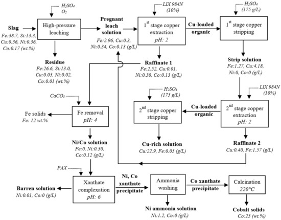 The present study focuses on the process development of slag to recover cobalt, nickel, copper, and iron using hydrometallurgical methods. The slag sample utilized in this study is of an amorphous nature originating from a copper–nickel smelter in Botswana. The HPAL method is investigated at mild operating conditions, lower temperatures (~150 °C) and pressure (0.6 MPa), to selectively leach the finely dispersed metal sulfides from the slag. Leaching of low-grade material such as slag results in a dilute solution; therefore, to enrich the metal values after the leaching process, a combination of solvent extraction, selective precipitation, and xanthate complexation processes was employed to separate and upgrade the metal ions of Cu, Ni, and Co from the dilute pregnant leach solution (PLS) as well as separate the Fe impurity from the solution. The separation of Ni and Co from aqueous solutions is commonly conducted by solvent extraction; however, in this study, the xanthate complexation process was applied, utilizing potassium amyl xanthate (PAX) as a chelating agent. Alkali xanthates form xanthate complexes in the form of precipitates with various metal ions from the solution. The difference in the solubility product constant (Ksp) of these xanthate complexes allows for the selective separation of metal ions from the solution [22]. The utilization of the xanthate complexation method offers a cost-effective alternative to solvent extraction while demonstrating a high level of selectivity for the desired metal. Additionally, the widespread availability of PAX reagent further enhances its practicality and applicability.