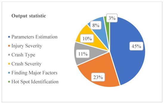 We reviewed a number of research studies conducted within the past year, and the result as shown in Figure 1 showed depicted that researchers have utilized the following inputs to investigate accidents with heavy vehicles more comprehensively. Roadway characteristics and environmental conditions appeared to be the most frequently recorded factors in heavy vehicle crashes, both at 13%, indicating their importance in the occurrence of heavy vehicle crashes. Vehicle volume and speed followed those factors at 12%, respectively. Although injuries and fatalities seem to be important in heavy vehicle crashes, only 11% of the studies addressed them. The next priorities involved consideration of driver characteristics and temporal parameters, as well as crash characteristics and vehicle damage. As it shown in Figure 2 the results included parameter estimation, which was the most significant goal, at a percentage of 45.21%, indicating the potential impact on understanding the occurrence. Injury severity, at a percentage of 23.29%, was also a critical factor to consider for reducing the impact of crashes and ensuring the safety and well-being of individuals involved in the accident. Crash types and crash severity were observed in the results of recent research at 10.96% and 9.59%, respectively.